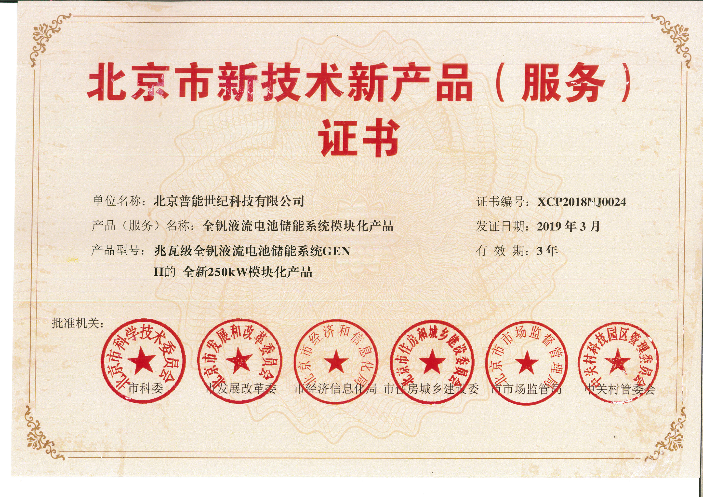 2019年4月19日,普能公司自主研发生产的“全钒液流电池储能系统250kW GEN II”获得《北京市新技术新产品(服务)证书》,享受政府采购和推广应用等政策支持。此项认证是由北京市新技术新产品(服务)认定工作小组颁发,小组由市科学技术委员会、市发展和改革委员会、市经济和信息化委员会、市城乡和住房建设委员会、市质量监督局、中关村科技园区管委会共同组成,负责北京市新技术新产品(服务)认定工作的组织实施。